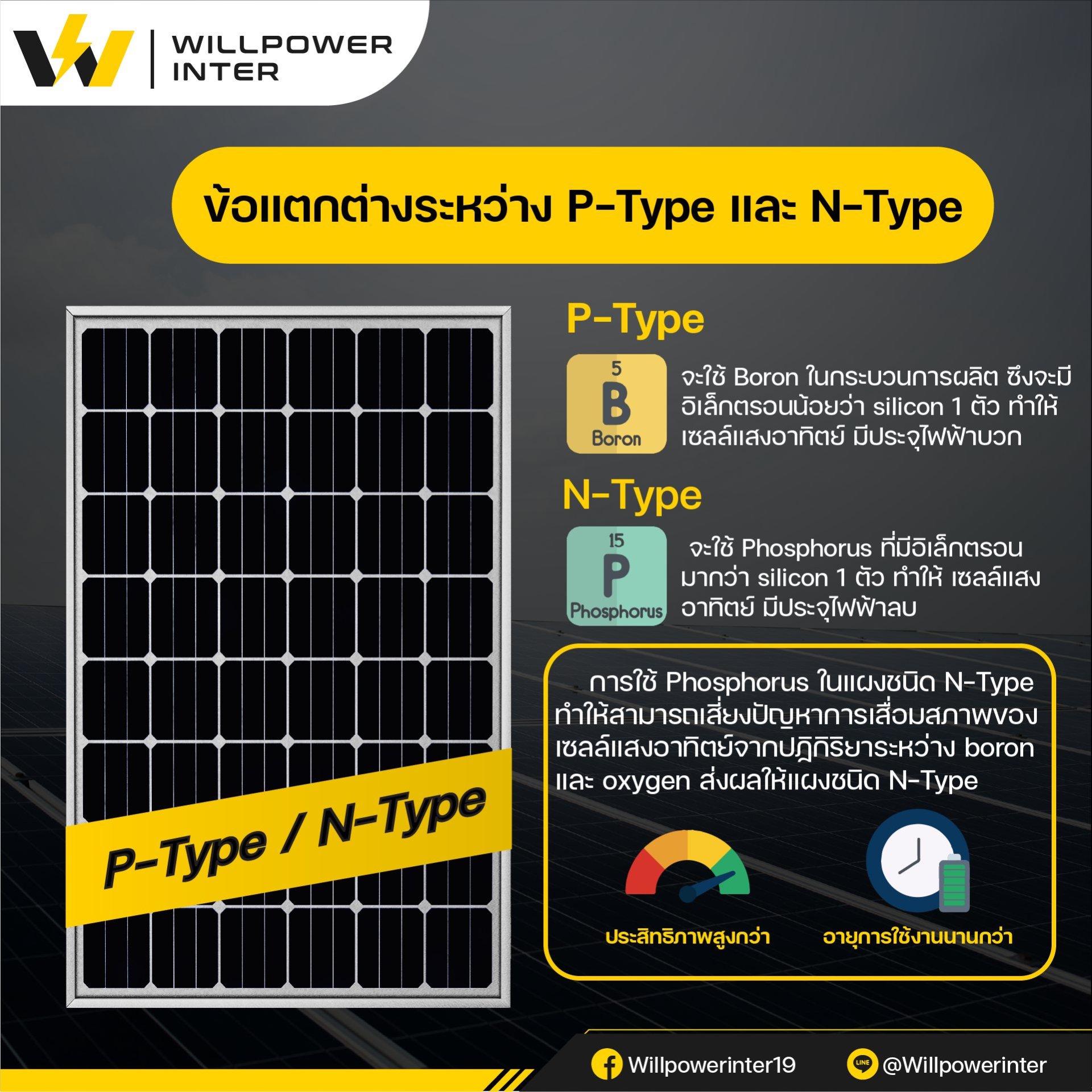 ในการเลือกซื้อแผงโซลาร์เซลล์ปัจจุบัน นอกจากเรื่องวัตต์แล้ว คำศัพท์ที่เริ่มได้ยินบ่อยขึ้นคือ "P-Type" และ "N-Type" ซึ่งเป็นเทคโนโลยีสารกึ่งตัวนำภายในเซลล์แสงอาทิตย์ ข้อมูลจาก Willpower Inter และแหล่งข้อมูลอุตสาหกรรมทั่วโลกยืนยันตรงกันว่า N-Type กำลังเข้ามาเป็นมาตรฐานใหม่แทนที่ P-Type เดิม ด้วยเหตุผลเรื่องประสิทธิภาพและความทนทาน