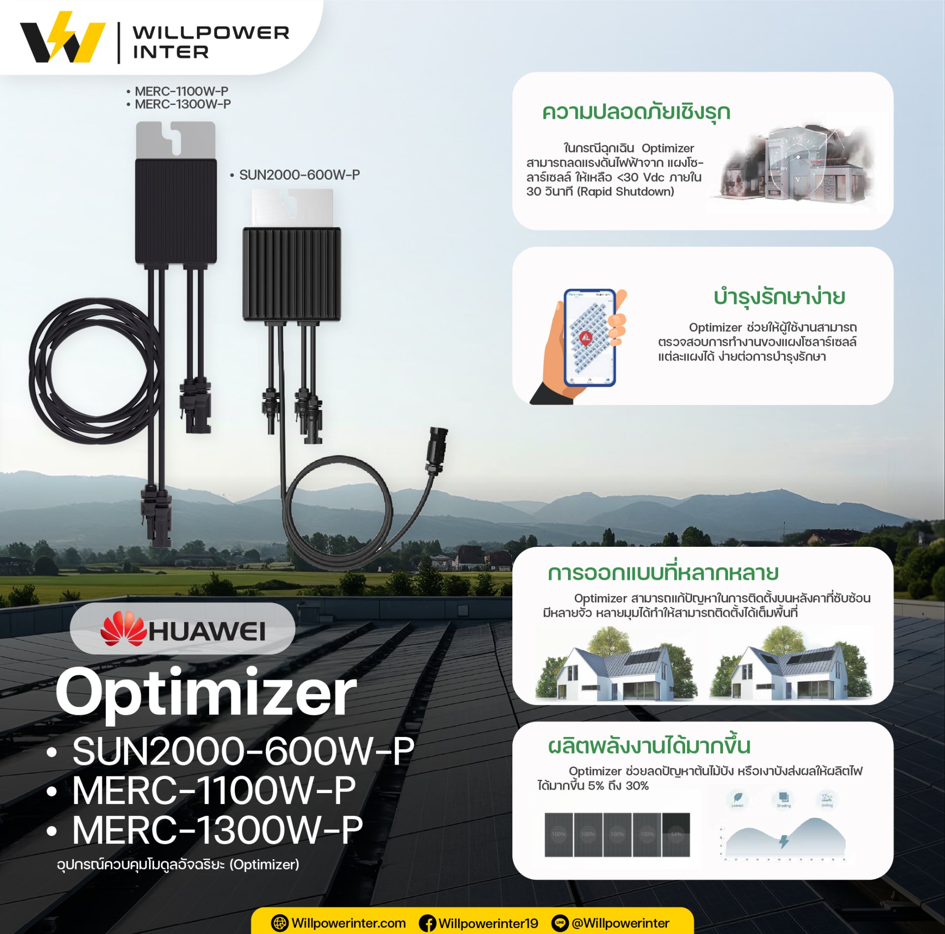 • Optimizer ช่วยลดปัญหาต้นไม้บัง หรือเงาบังส่งผลให้ผลิตไฟได้มากขึ้น 5% ถึง 30%