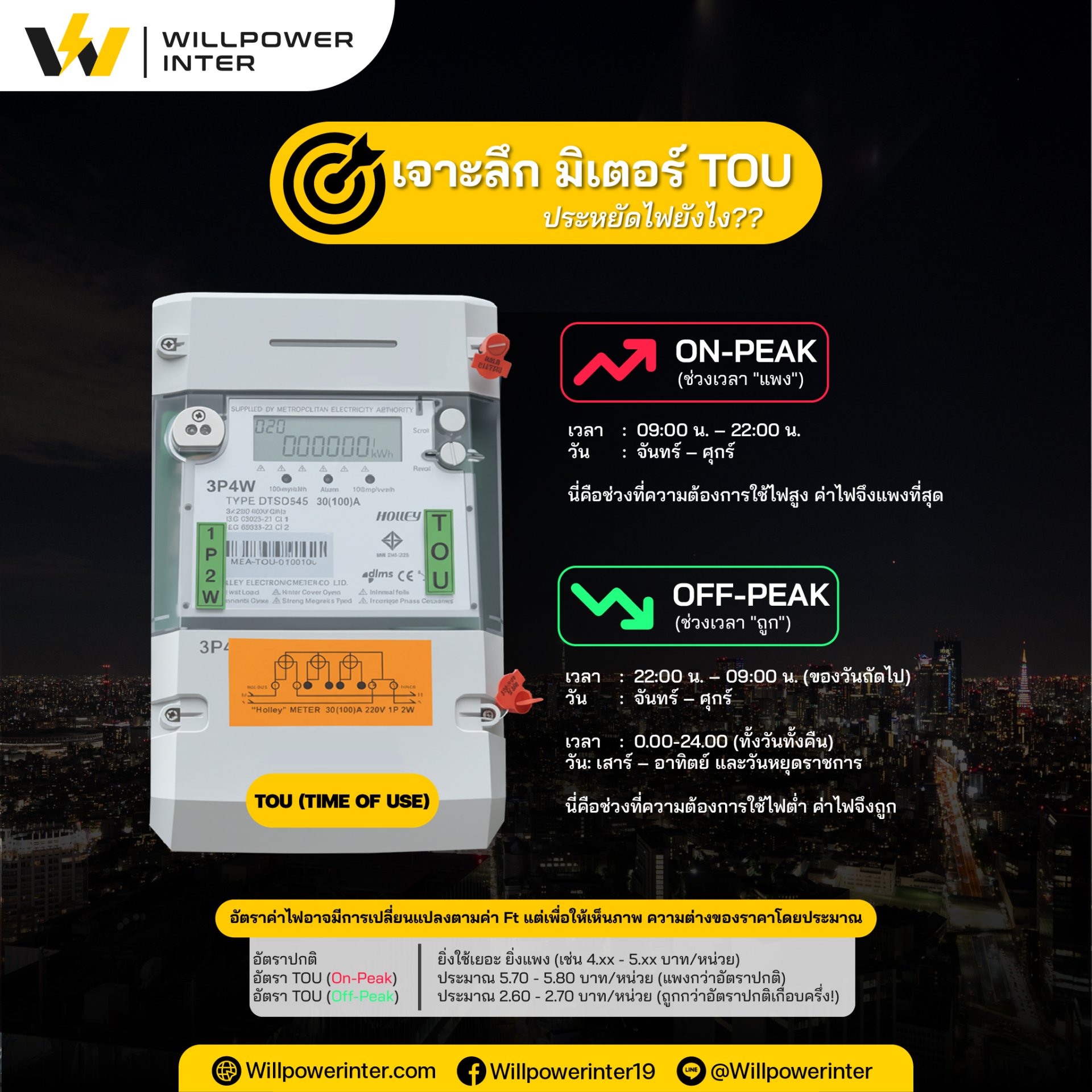 มิเตอร์ TOU คือมิเตอร์ที่คิดค่าไฟ 2 อัตรา ไม่ใช่ราคาเดียวตลอด 24 ชั่วโมง โดยแบ่งเวลาชัดเจนว่าตอนไหน "แพง" และตอนไหน "ถูก"