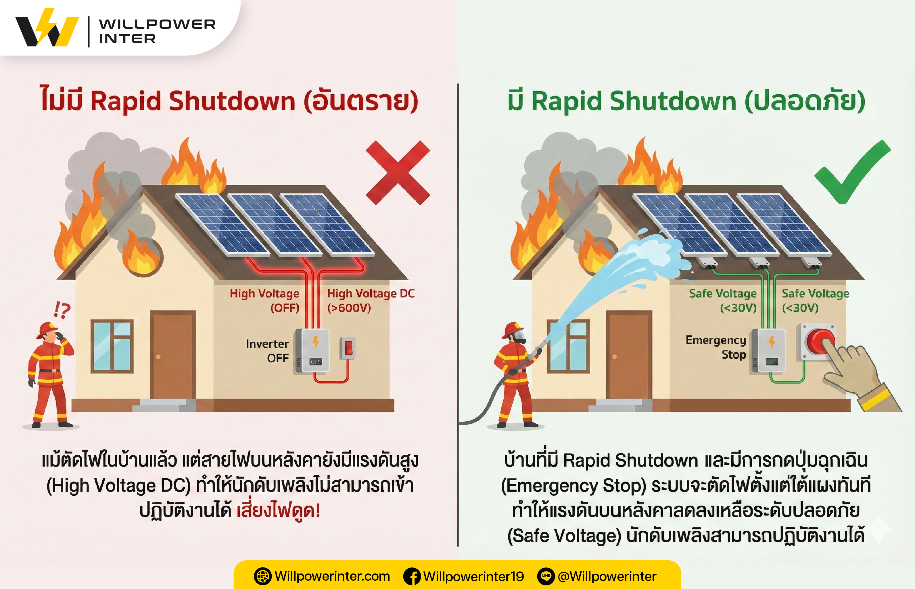 เมื่อเกิดเหตุฉุกเฉิน เช่น ไฟไหม้ หรือต้องการซ่อมบำรุง เรามักจะทำการตัดไฟที่ Inverter ซึ่งการกระทำนี้ "ตัดไฟที่เข้าสู่ตัวบ้านเท่านั้น" แต่ตราบใดที่พระอาทิตย์ยังส่องแสง แผงโซลาร์บนหลังคายังคงผลิตไฟฟ้าแรงดันสูงค้างอยู่ในสายไฟบนหลังคาตลอดเวลา