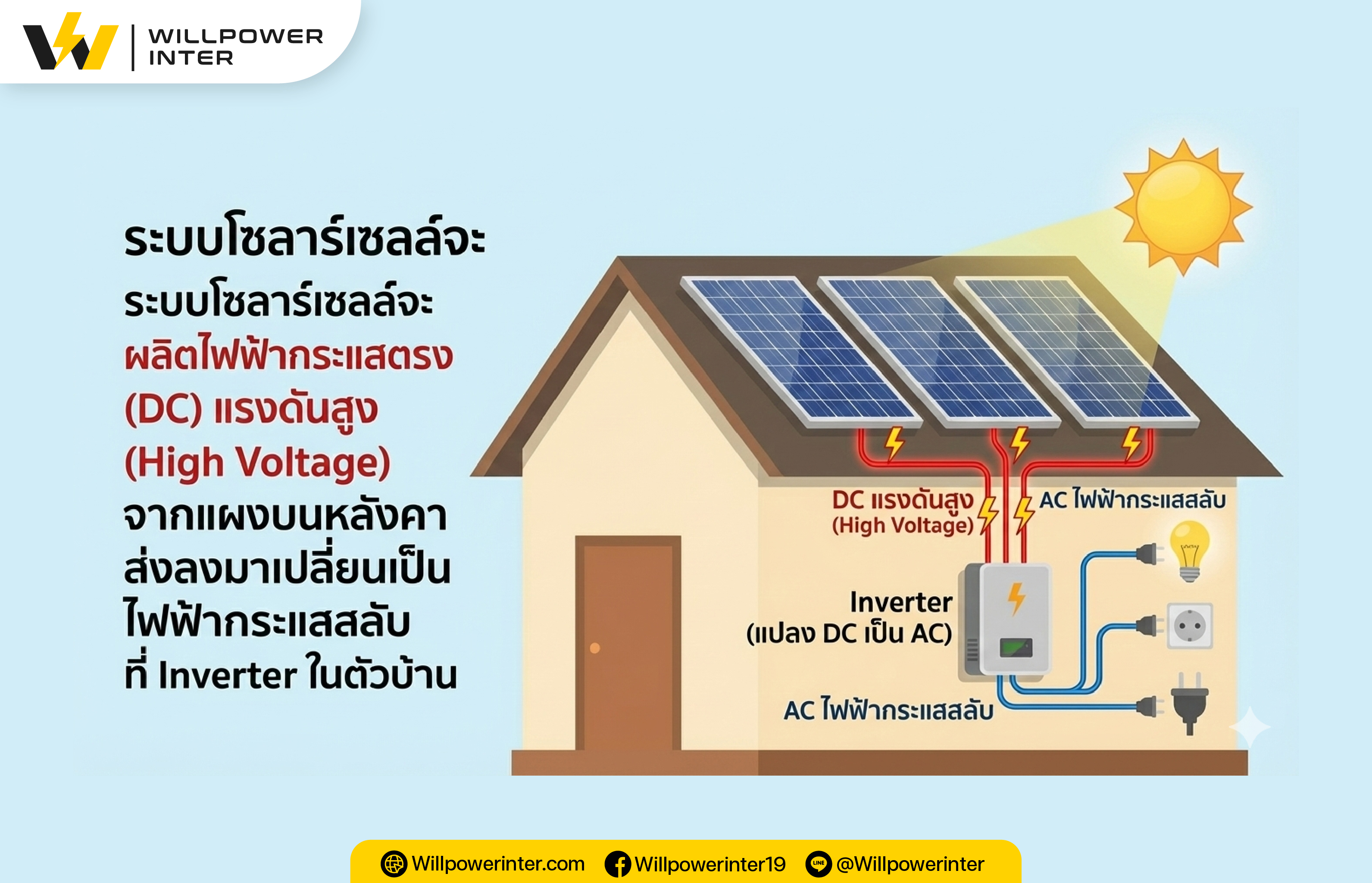 ในสภาวะปกติ ระบบโซลาร์เซลล์จะผลิตไฟฟ้ากระแสตรง (DC) แรงดันสูง (High Voltage) จากแผงบนหลังคา ส่งลงมาเปลี่ยนเป็นไฟฟ้ากระแสสลับที่ Inverter ในตัวบ้าน