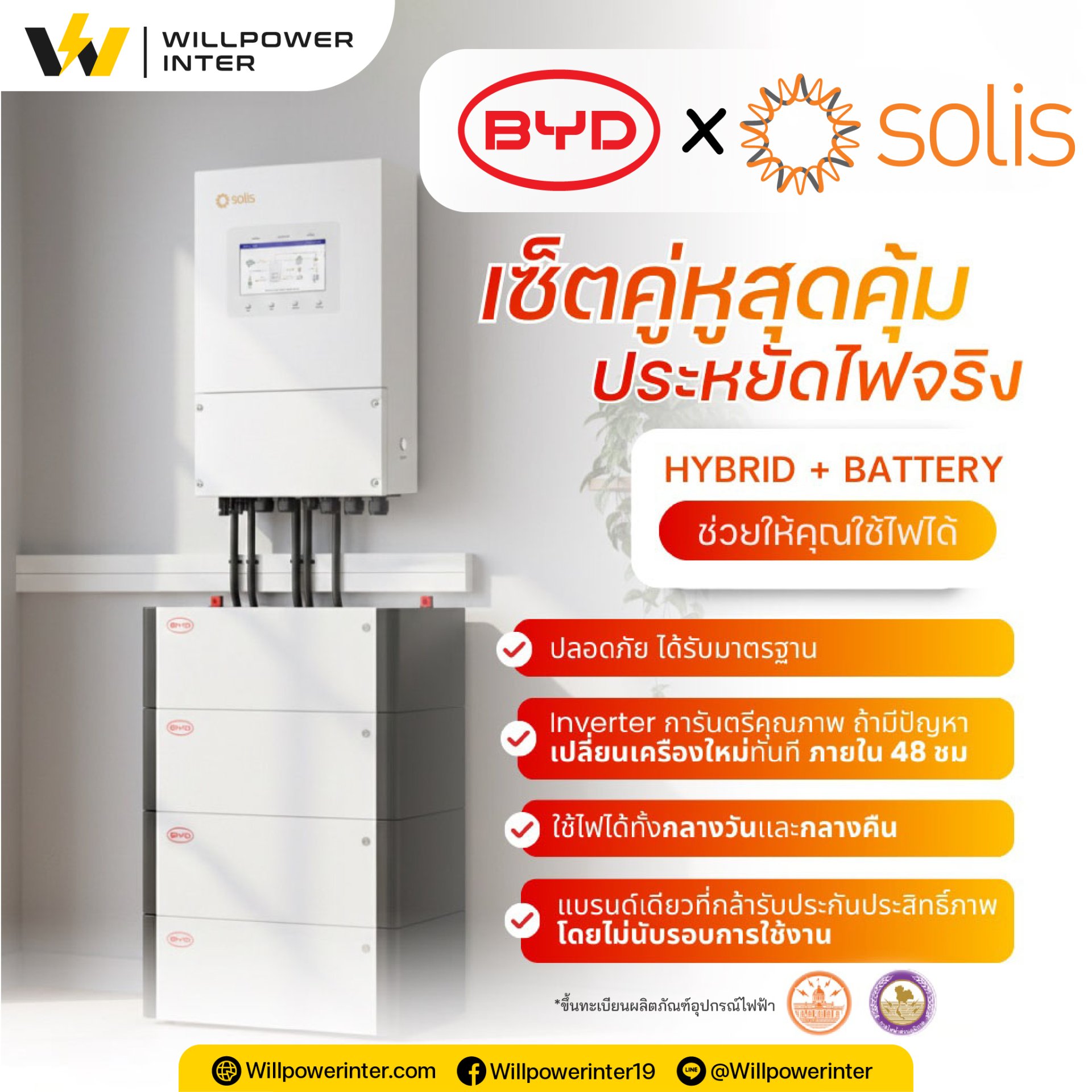 ใครว่าโซลาร์เซลล์ประหยัดไฟได้แค่ตอนมีแดด? ยุคนี้ต้อง Hybrid + Battery เท่านั้น! Willpower Inter ขอนำเสนอ "เซตคู่หูสุดคุ้ม" ระหว่าง BYD ผู้นำด้านแบตเตอรี่ระดับโลก และ Solis อินเวอร์เตอร์คุณภาพสูง ที่มาร่วมมือกันแก้ปัญหาค่าไฟแพงให้คุณได้ตลอด 24 ชั่วโมง