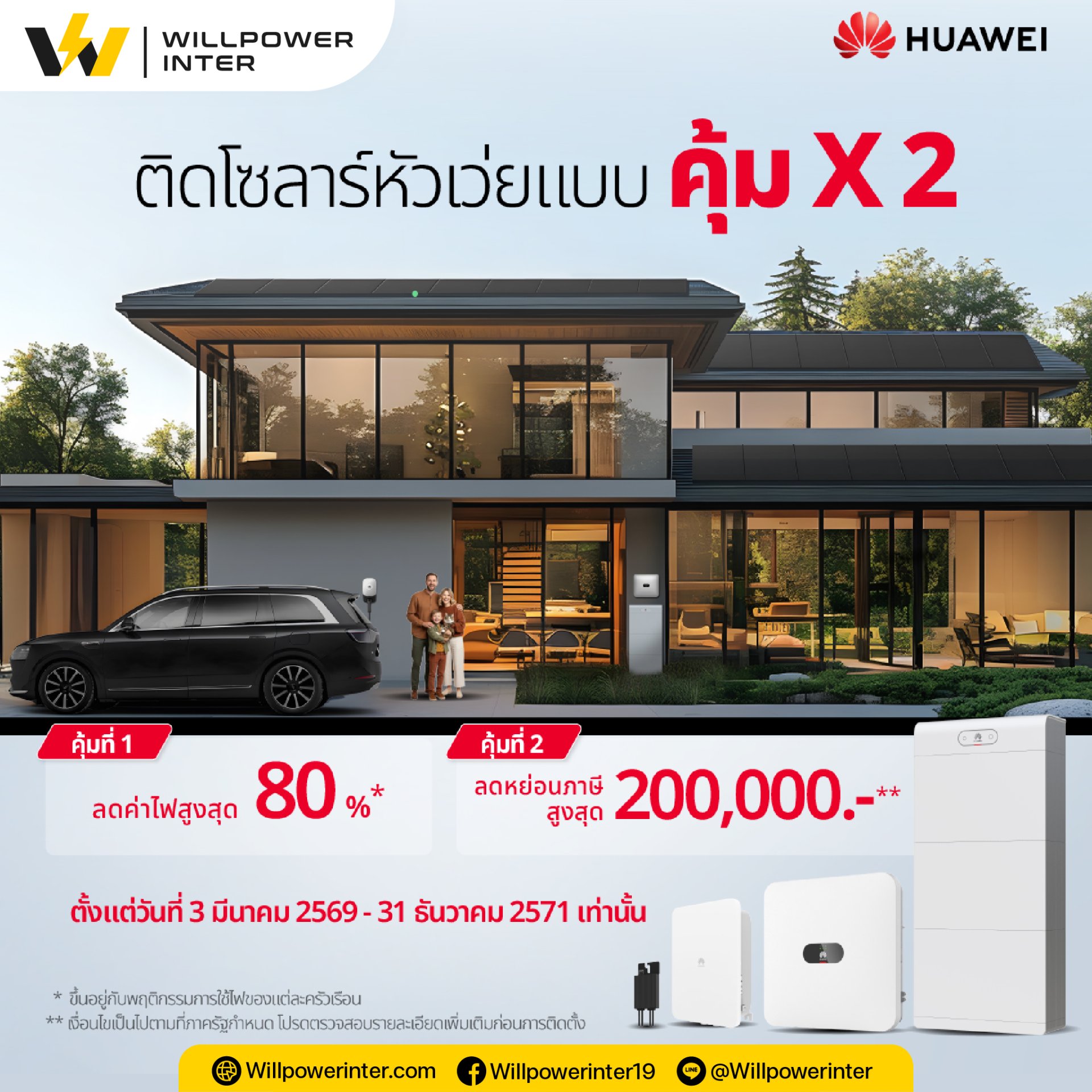 ติดโซลาร์เซลล์ Huawei วันนี้ คุ้ม X 2! ลดค่าไฟ 80% พร้อมรับสิทธิลดหย่อนภาษีสูงสุด 2 แสนบาท